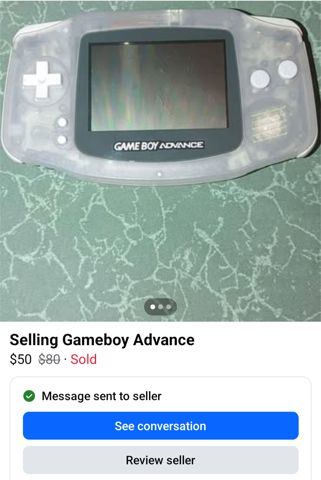 | Used Gameboy Advance - Glacier | Facebook Marketplace | $50 |